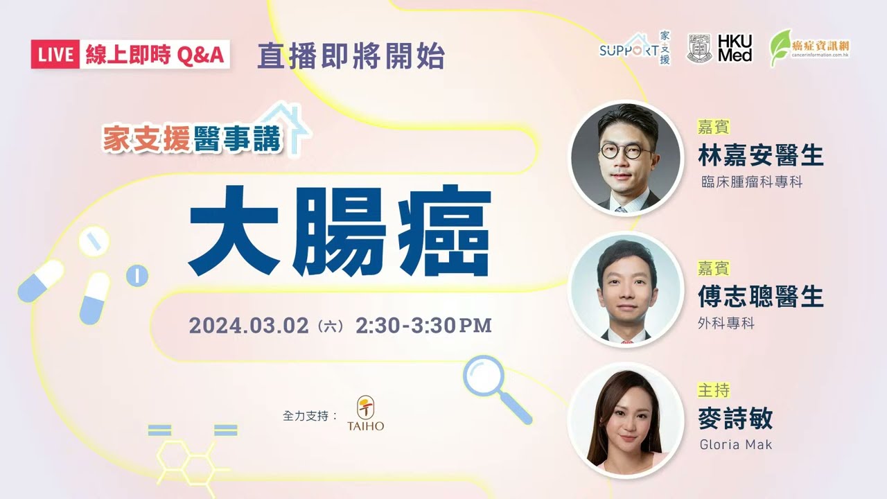 首場「家支援醫事講」,我哋請嚟臨床腫瘤科專科 林嘉安醫生以及外科專科 傅志聰醫生為我地深入淺出解構大腸癌,特別係擴散性大腸癌手術及藥物治療方面嘅選擇。